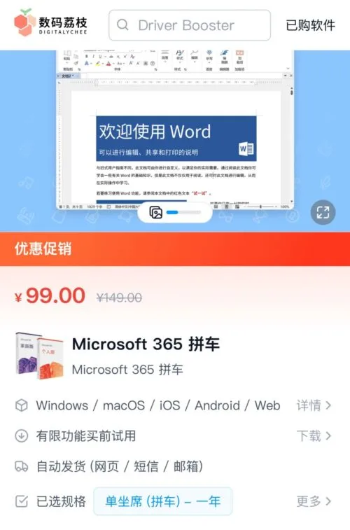数码荔枝 同样也是国内知名的正版软件分销商城,它的 Microsoft 365 拼车服务上线没那么早,但很“稳”:记忆中从没变过价格,且持续销售从未中断过。